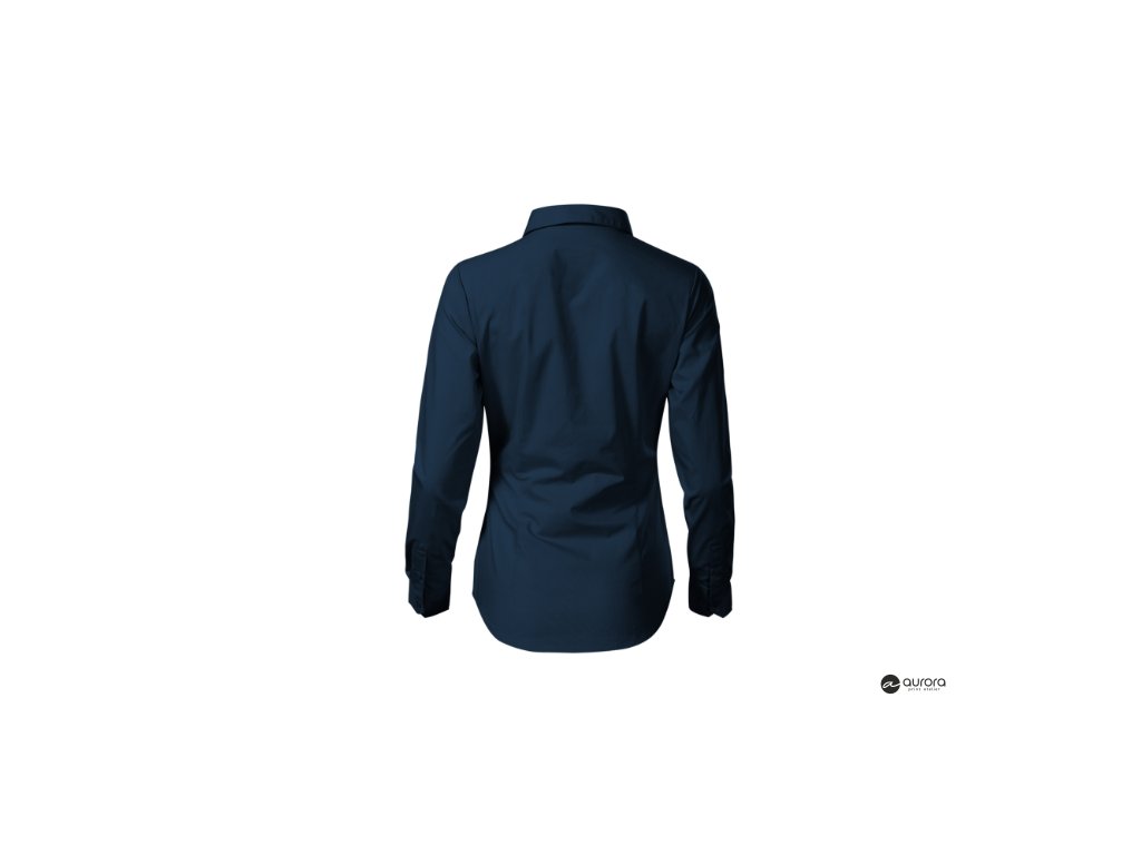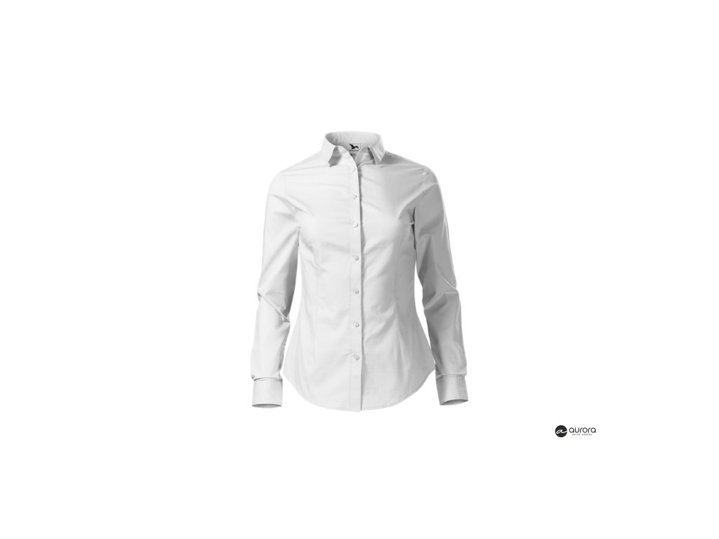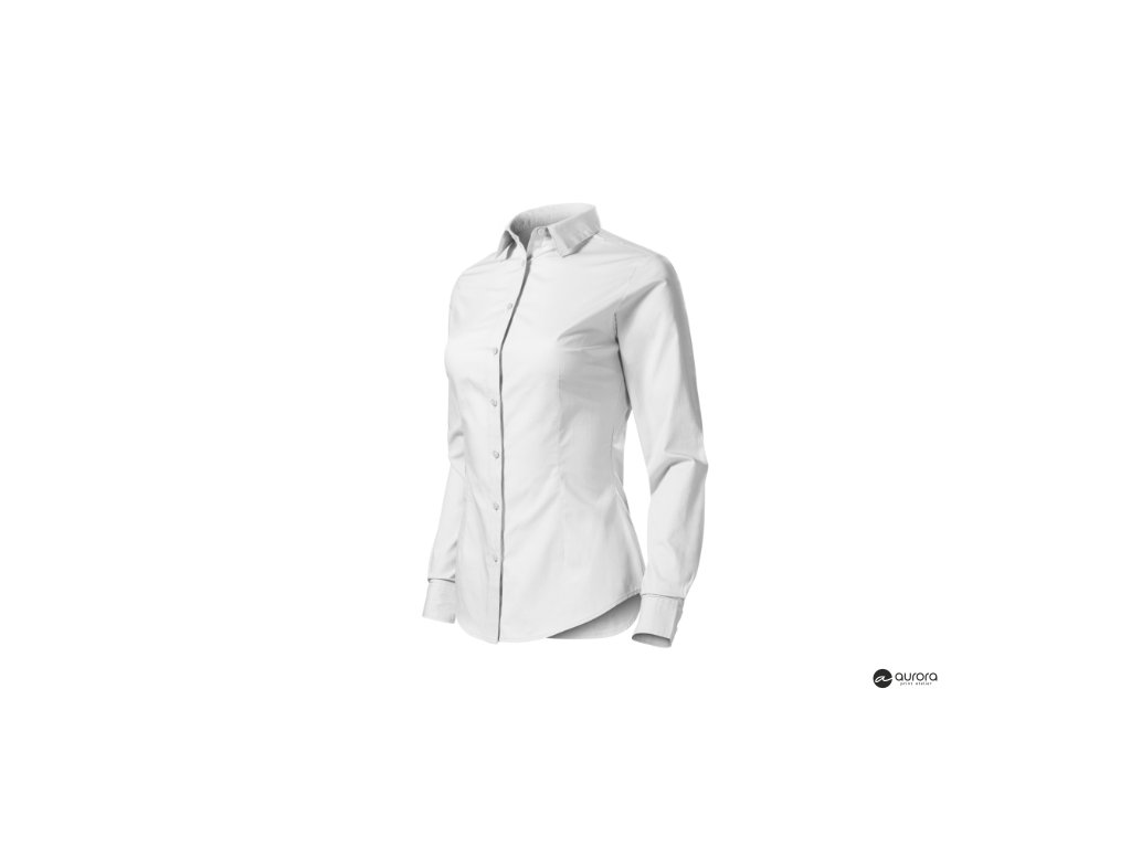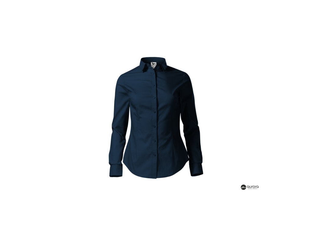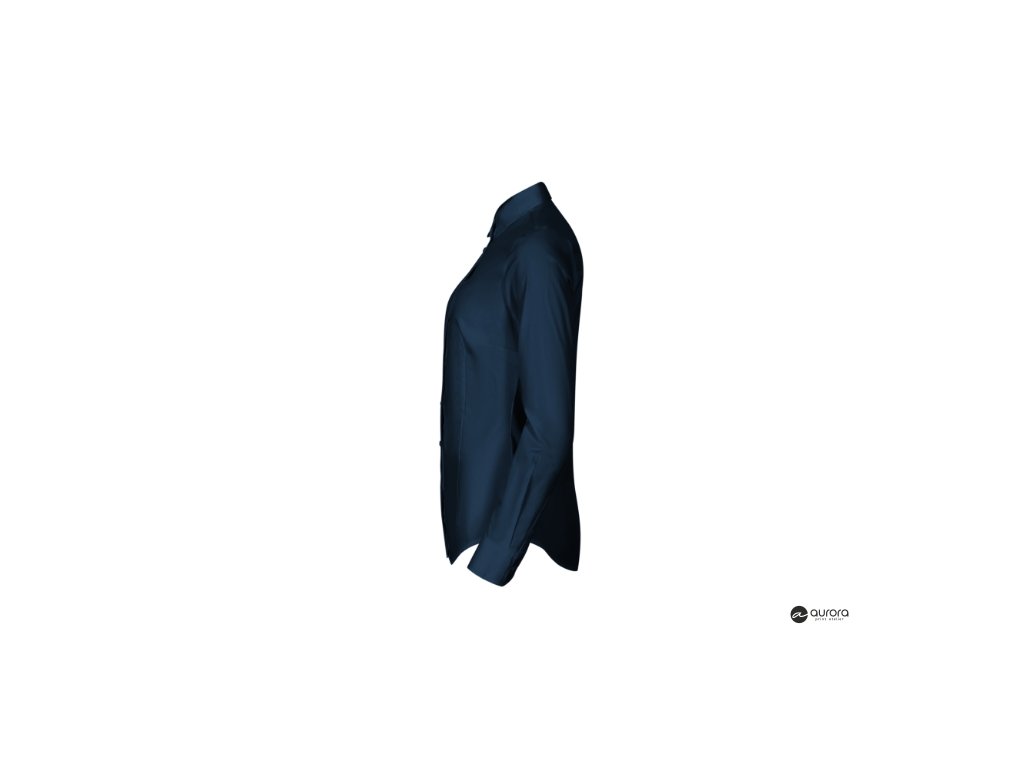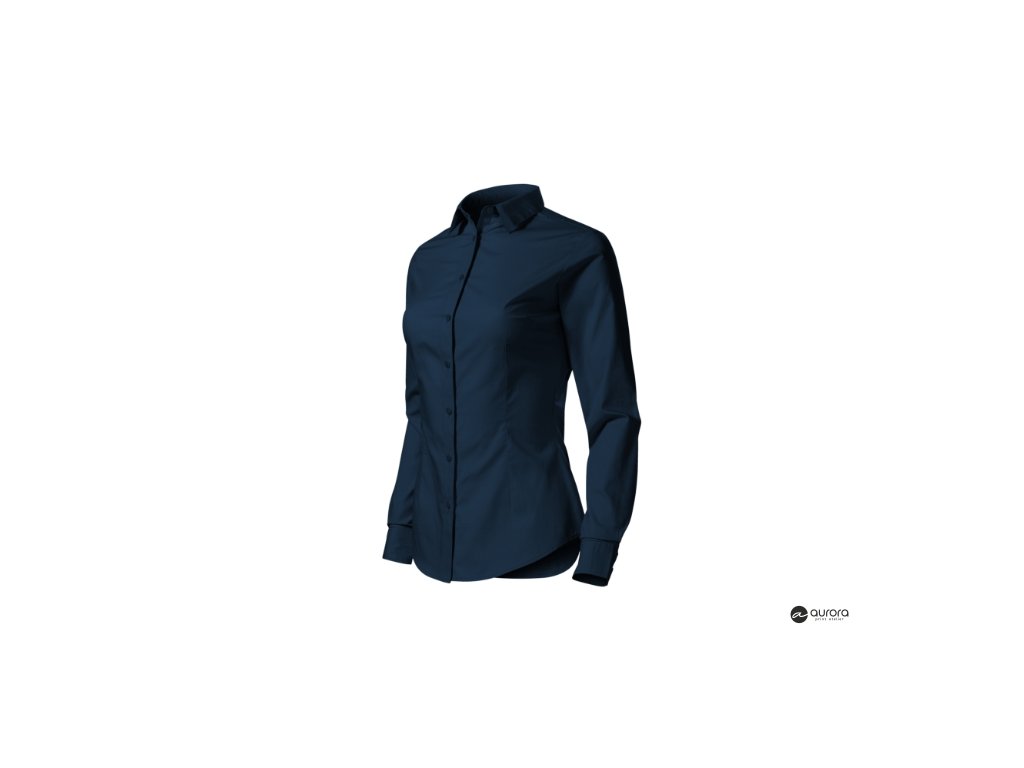 zúžený strih s bočními švami, pásové a prsné záševky, dvojdielny košeľový golier, predné kraje začistené légou, dlhé rukávy so šikmou manžetou na 2 gombíčky, gombíčky vo farbe materiálu (2 náhradné naviac), tvarovaný dolný okrajDodatočné parametre