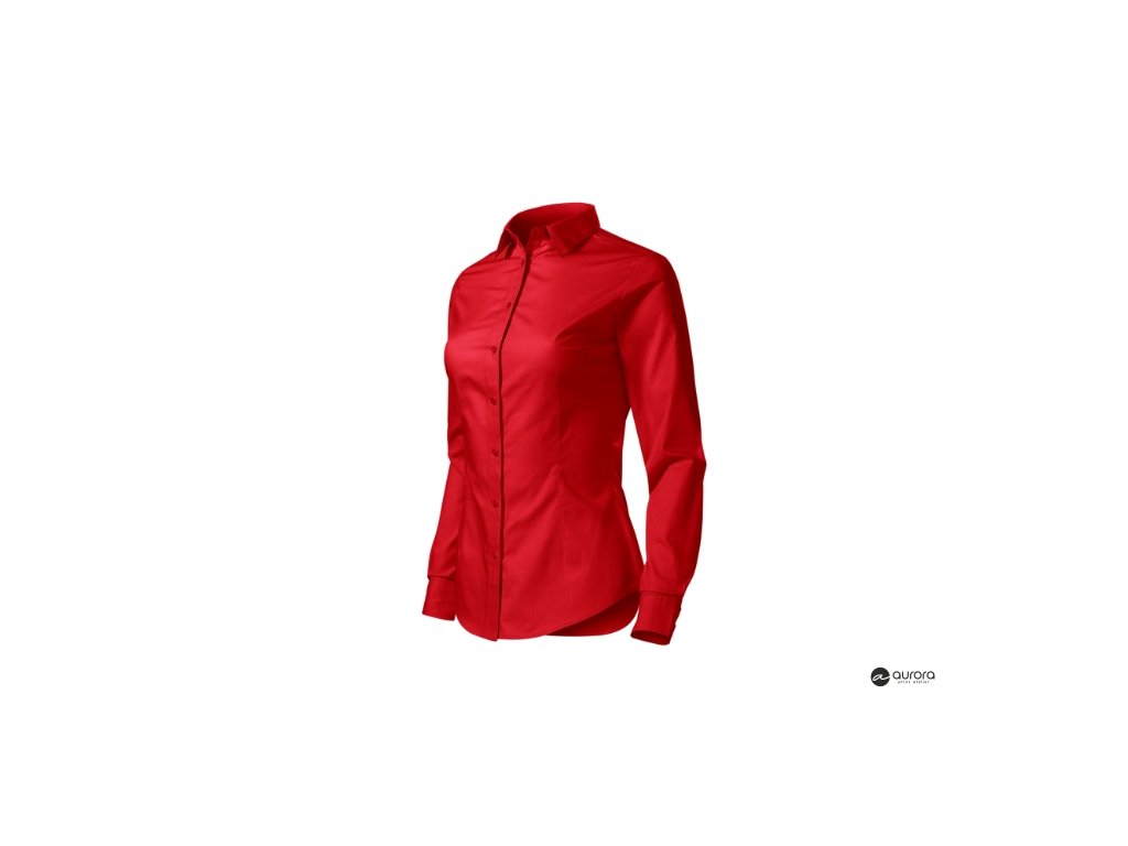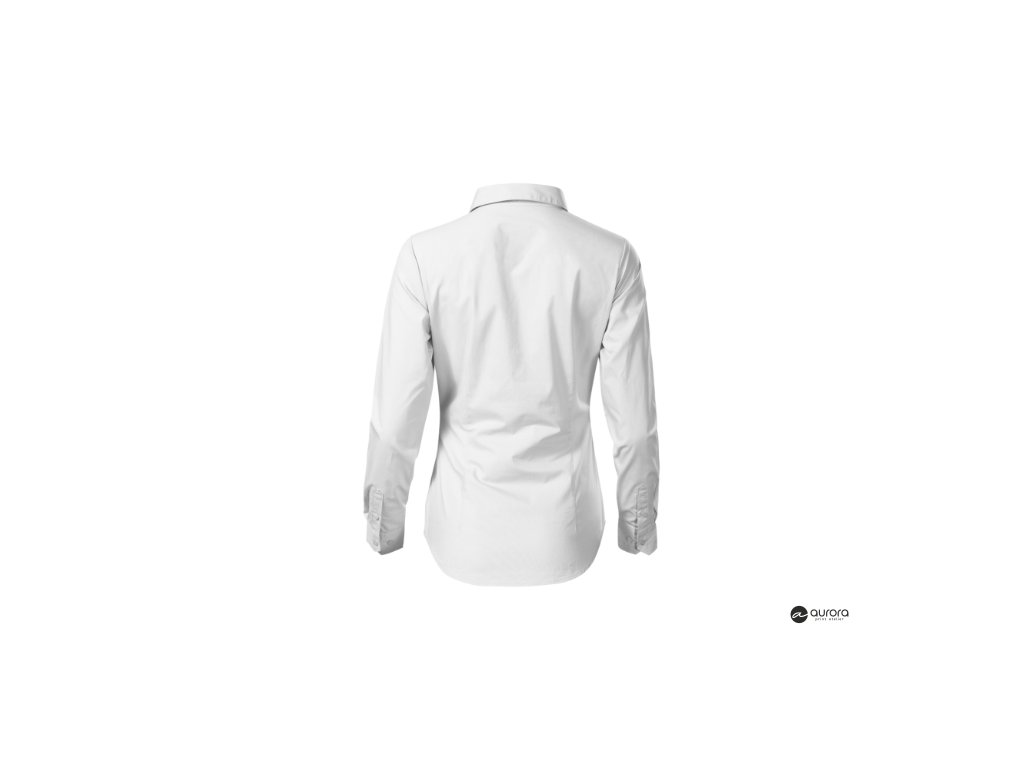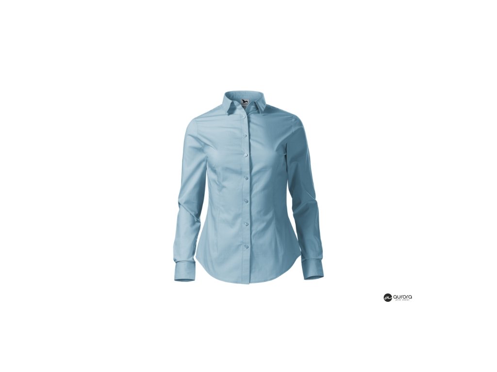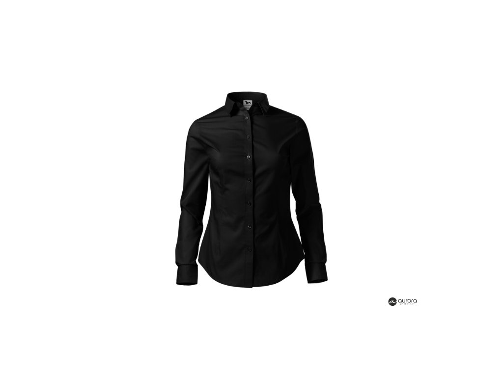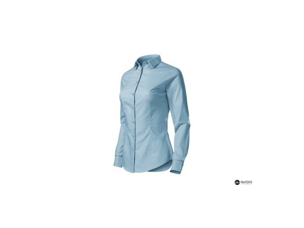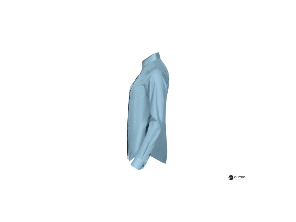 zúžený strih s bočními švami, pásové a prsné záševky, dvojdielny košeľový golier, predné kraje začistené légou, dlhé rukávy so šikmou manžetou na 2 gombíčky, gombíčky vo farbe materiálu (2 náhradné naviac), tvarovaný dolný okrajDodatočné parametre